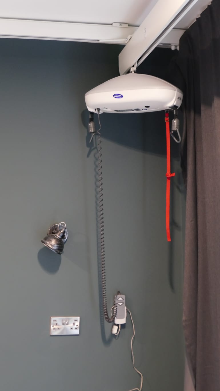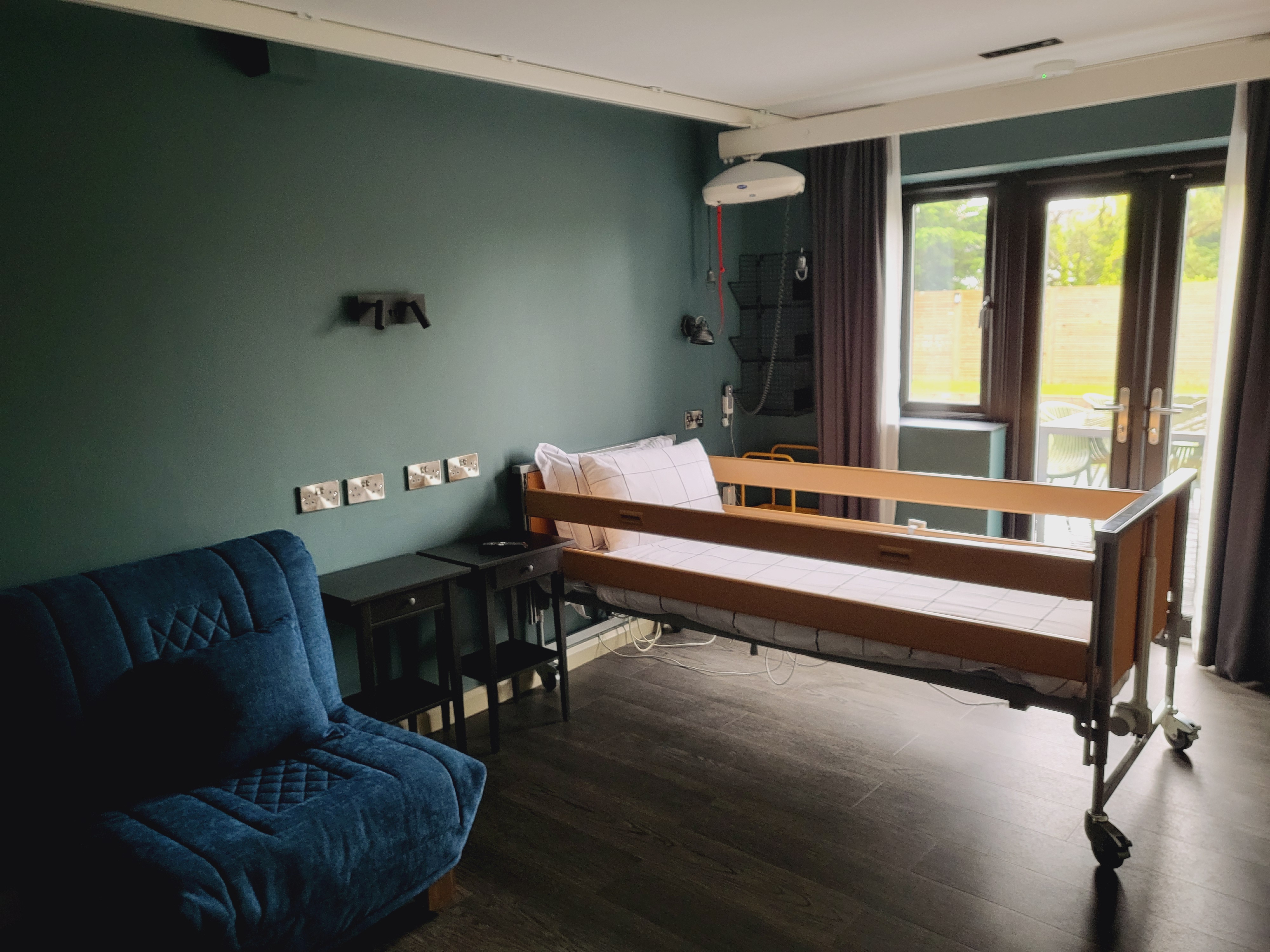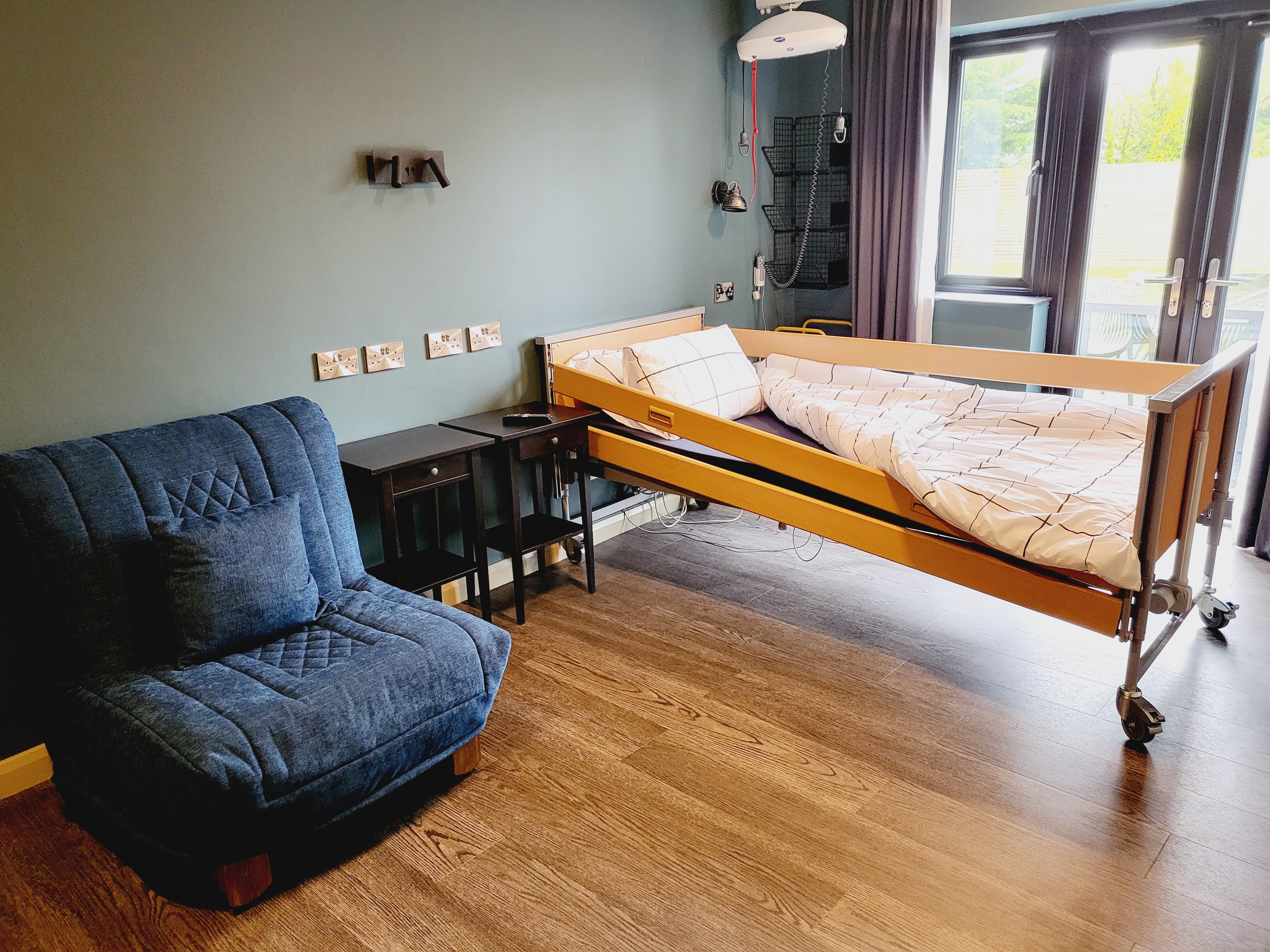 This room has been fully adapted to support people with the most complex health needs. It has an H frame ceiling hoist and high low profiling bed with sides. The second bed is a chair which can be used by carers then turned into a full size single bed with upgraded memory foam topped mattress. The bed wall has 10 double sockets at both standard and waist height to allow for all required equipment. We have added plenty of storage in this room which includes 2 moveable trollies. We have added wall lights which can be controlled from a main switch and also a switch on each light for ease of use, plus ceiling spot lights which can be positioned to suit the individual. This room has direct level access to the garden and a deck with ramp, leading to the main seating area. The accessible wet-room is attached to this bedroom although the track hoist does not follow through to the bathroom due to ceiling heights and a structural beam. Low level garment hanging rails and clothes storage. The room is set up for 2 profiling beds therefore a second can be hired at a reasonable cost locally if necessary. Our local supplier can also loan a bed extension if necessary. We hope to add an adult Careflex chair very soon.