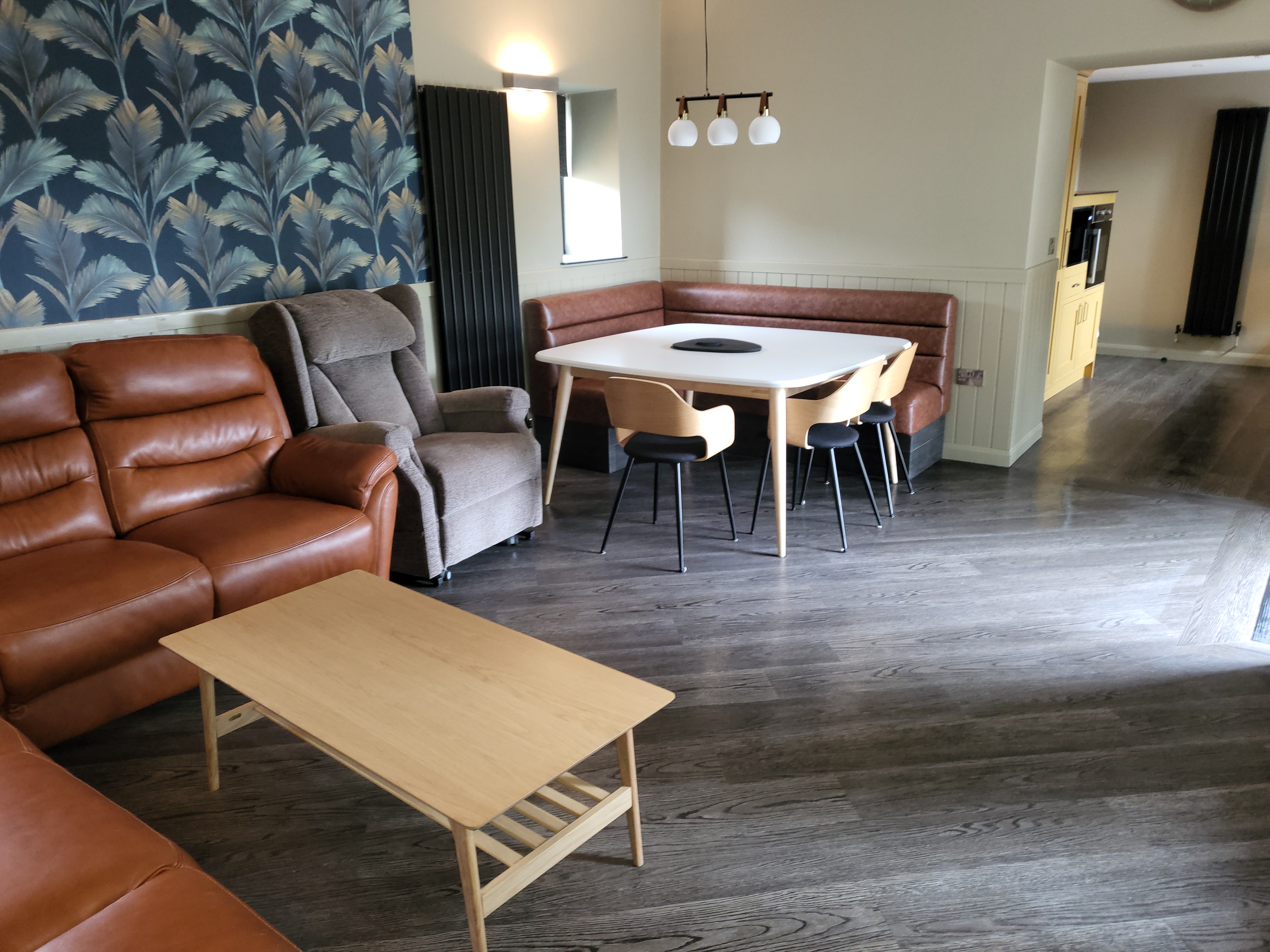 The lounge is large and open with attached dining area. Plenty of room for wheelchairs to turn around. Corner leather sofa with 2 reclining seats. Wide open doorway into kitchen. Various different lighting arrangements to suit all needs. Coat and shoe storage next to entrance doorway. Square dining table with bench seating which can accommodate up to 9 people with space for a wheel chair. Riser feet can be added to the dining table if needed. All rooms have a Smart TV and the bungalow has high speed broadband.