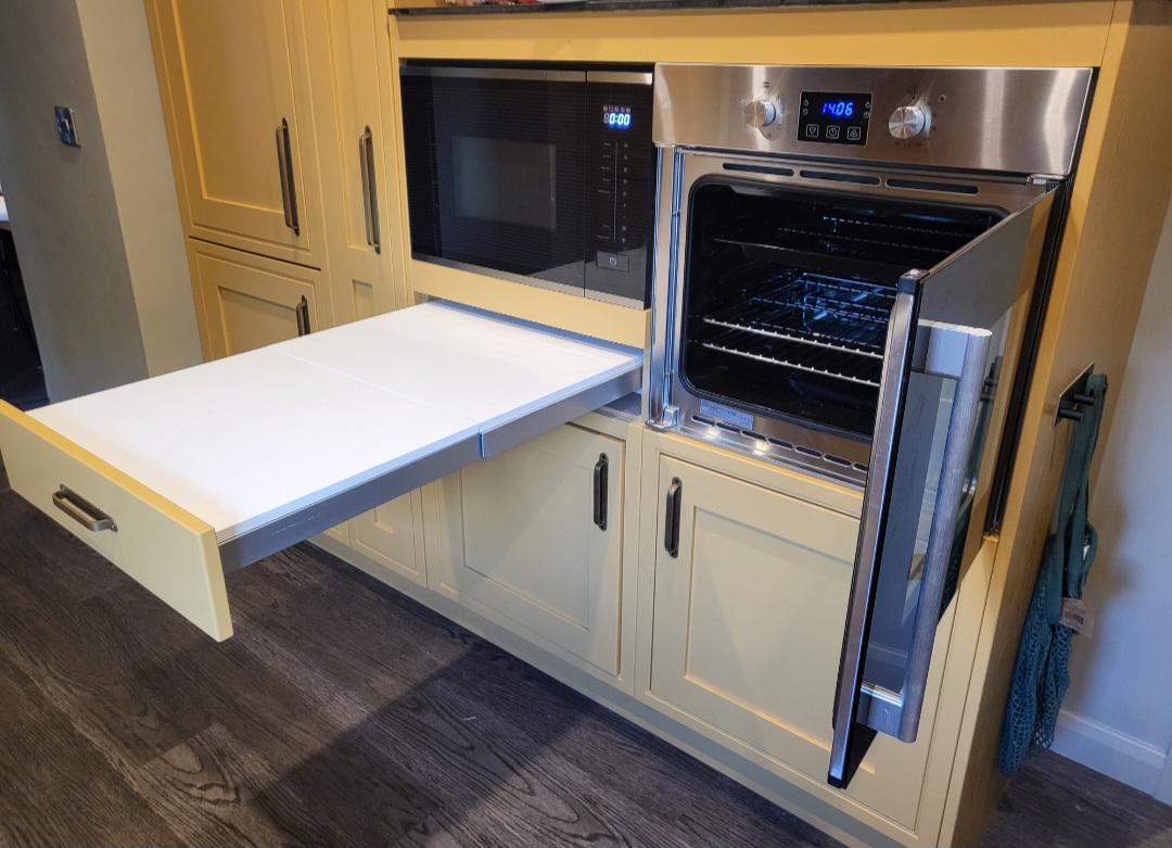 This is open plan onto the lounge/dining area. The kitchen has a side opening microwave and an oven with pull out integrated wheelchair accessible work surface. Side mounted tap for easier access. Low level storage of crockery and equipment. Pull out larder food storage cupboard. Breville Hotcup water dispenser alongside a standard kettle. Please note that due to space constraints there is no washing machine or dryer at the property, however, there are washing machines and dryers less than a mile away at Siop Ellis/post office which are really accessible.